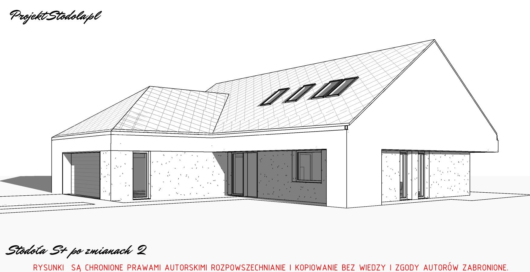 The Barn House S+ has undergone significant changes, including: narrowing the building, adding a gable roof over the garage, enlarging the garage, adapting the attic into rooms, changing the roof pitch to 35 degrees, changing the ceiling to a concrete one, placing it on a reinforced concrete slab, removing the column in the living room, relocating the stairs behind the wall with the television, and modifying selected windows.