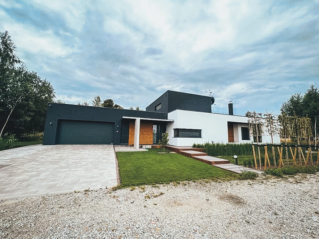 The front part of the house has fewer windows and a more austere shape, while the garden elevations are transparent, ensuring essential contact with nature. The development of the recreational area complements the architectural concept and emphasizes the modern design of the building. The planned architecture does not dominate but rather strives to integrate harmoniously with the existing context. The building incorporates energy-efficient technologies, sun protection systems, and a ventilation system with heat recovery.