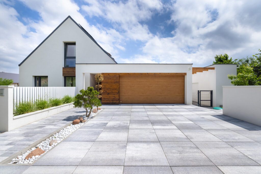 The garage structure separates the entrance area of the plot from the private recreational zone with a terrace and garden. By positioning the garage in this manner, it isolates this part of the garden from the access road, providing residents with the necessary privacy and additional protection against western winds.