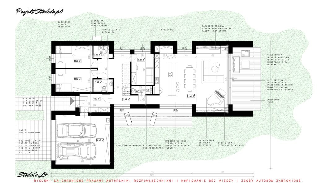 The drawing shows the minimum distances from the property boundary according to Polish building regulations. In your region, these distances may be different.