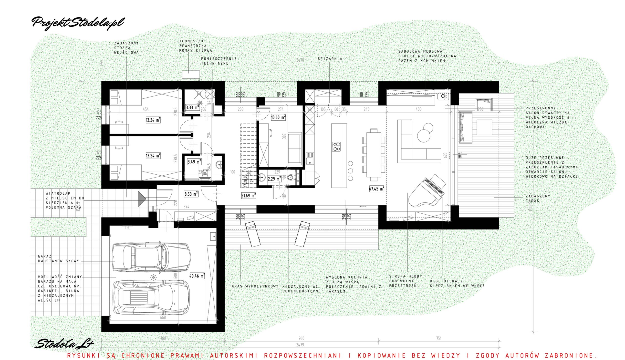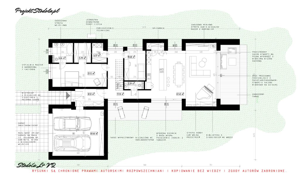 An expanded and larger version of the L-shaped barn. The building has a simple and clear functional layout. A covered zone leads to the building, and in the entrance area, there is a convenient vestibule connected to a two-car garage. The entire layout is organized along a central axis, ending with a living room. Glazed elements illuminate the space, enlarging it and providing a connection to the plot and terraces.