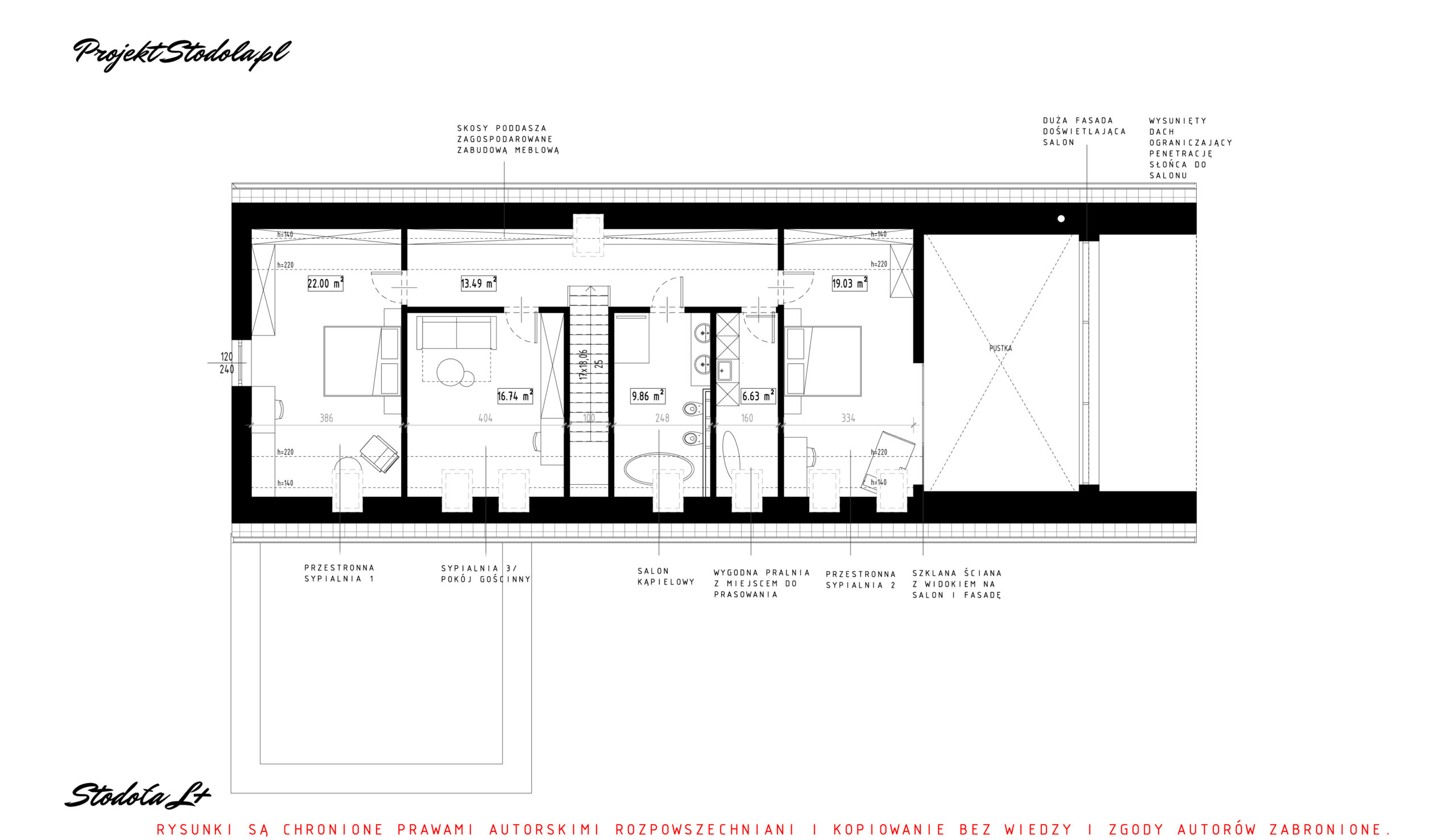 From the communication corridor, stairs lead to the attic. On the attic level, there are three bedrooms, a bathroom, and a laundry room with a drying and ironing area. The room on the front side has a window in the external wall, and the bedroom at the other end of the corridor is illuminated by roof windows. It also features glazing from the mezzanine to the living room, creating a very interesting element in the interior. There is a possibility to create independent walk-in closets in the bedrooms.