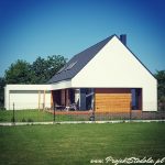 A simple two-story rectangular residential house with a symmetrical gable roof inclined at a 45° angle (ridge perpendicular to the access road). The design is compliant with the local zoning plan, featuring a symmetrical gable roof. A garage volume was added to the building on the entrance side (it can exist independently). The simplicity of the layout and construction makes the house straightforward and cost-effective to build. The façade of the building is modern and minimalist, with a natural tone – white combined with warm natural wood. There is an option to adapt the materials to match the local context. Urbanistically, the building suits a plot with access from the west or east, with a mirrored version available.