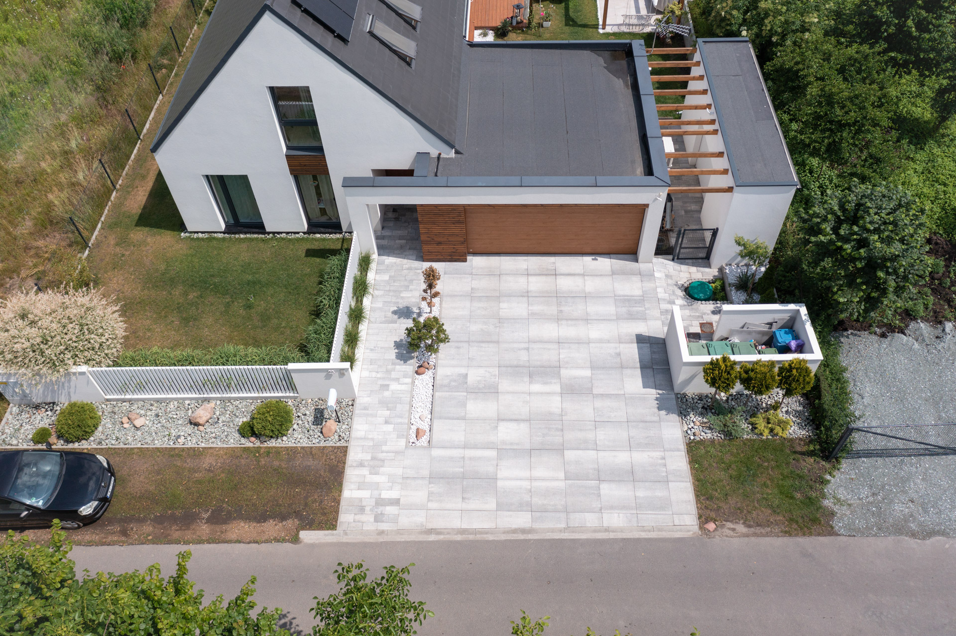 The building has a simple and clear functional layout. In the entrance zone, there is a convenient vestibule connected to the garage. On the ground floor, in the western part of the building, there is a sleeping area with a bathroom and stairs to the attic, under which a comfortable wardrobe is located. On the southeast side, the kitchen and dining room are located, connected to the living room, all opening up to the garden – the southern part of the plot – through large sliding glass panels. The living room is also open up to the full height, reaching the roof structure. On the attic, there are two rooms and a bathroom. The attic area offers great possibilities for arrangement and division (e.g., by reducing the elevated area of the living room, an additional room can be created in the attic). A detailed description of the functions can be found here.
