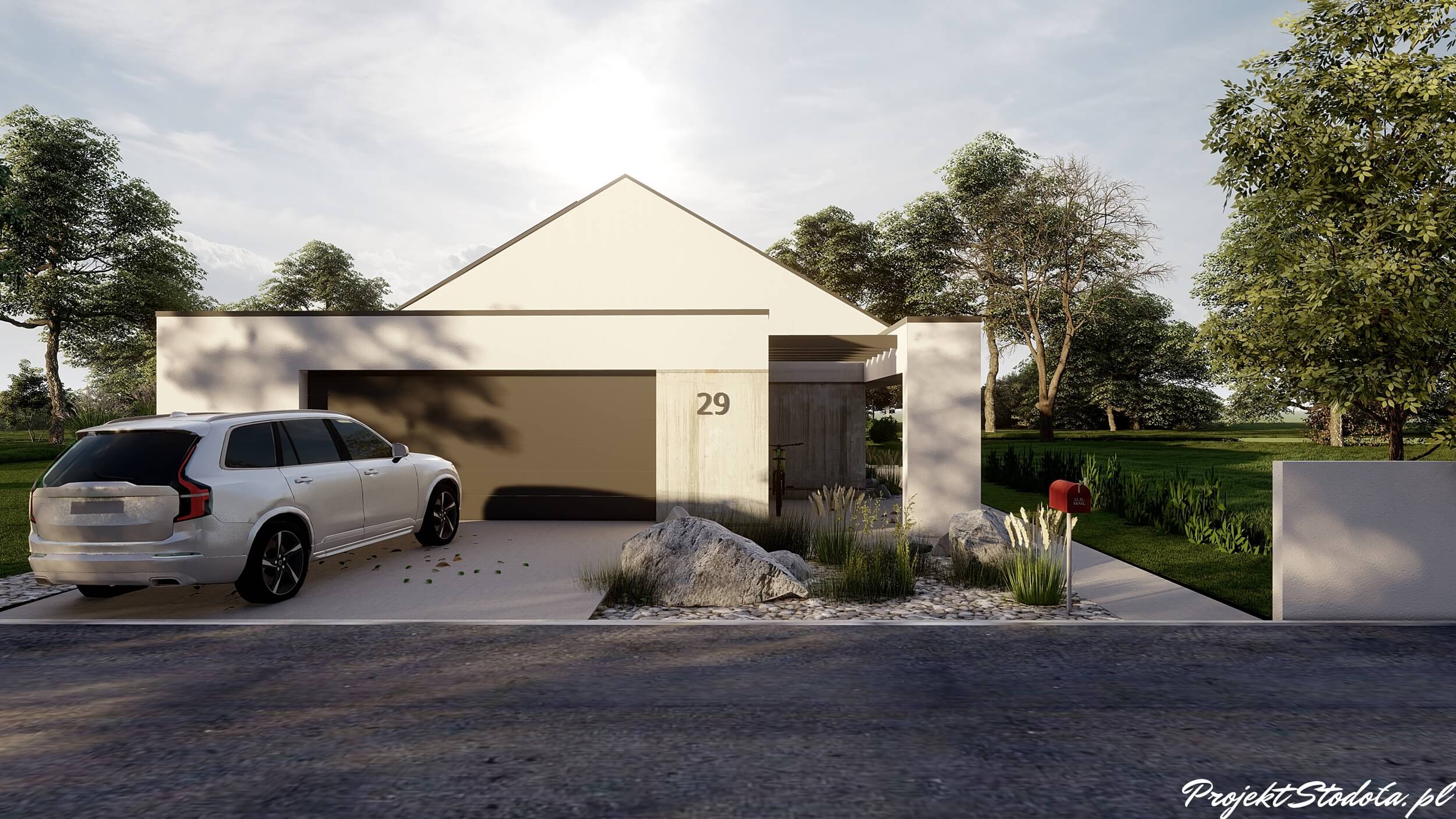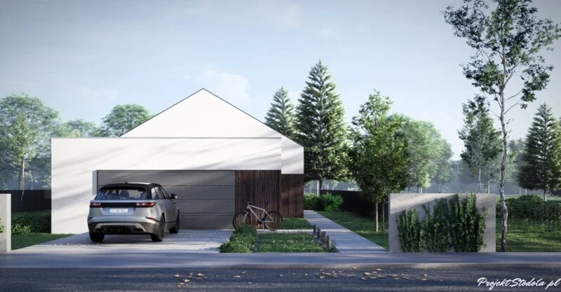 From the front side of the plot, a convenient two-car garage is designed, connected to the residential building through a utility room with a laundry area. The main entrance to the building, however, is designed on the side wall. This solution leads us directly into the vestibule, which is directly connected to the living area – the living room with the kitchen, which beautifully opens up to the garden through large windows. Upon entering such a high-ceilinged space, open to the roof structure, we will certainly make an impression on any visitor.