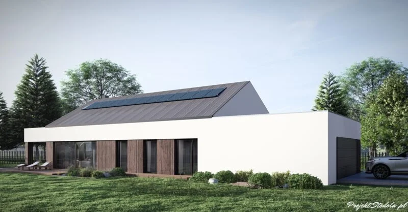 Barn House Optimum Long is an excellent proposal for a house project designed for narrow plots. It’s a single-story house, economical to build, optimized in terms of functions, structure, and energy efficiency. It features a simple, clear functional layout.