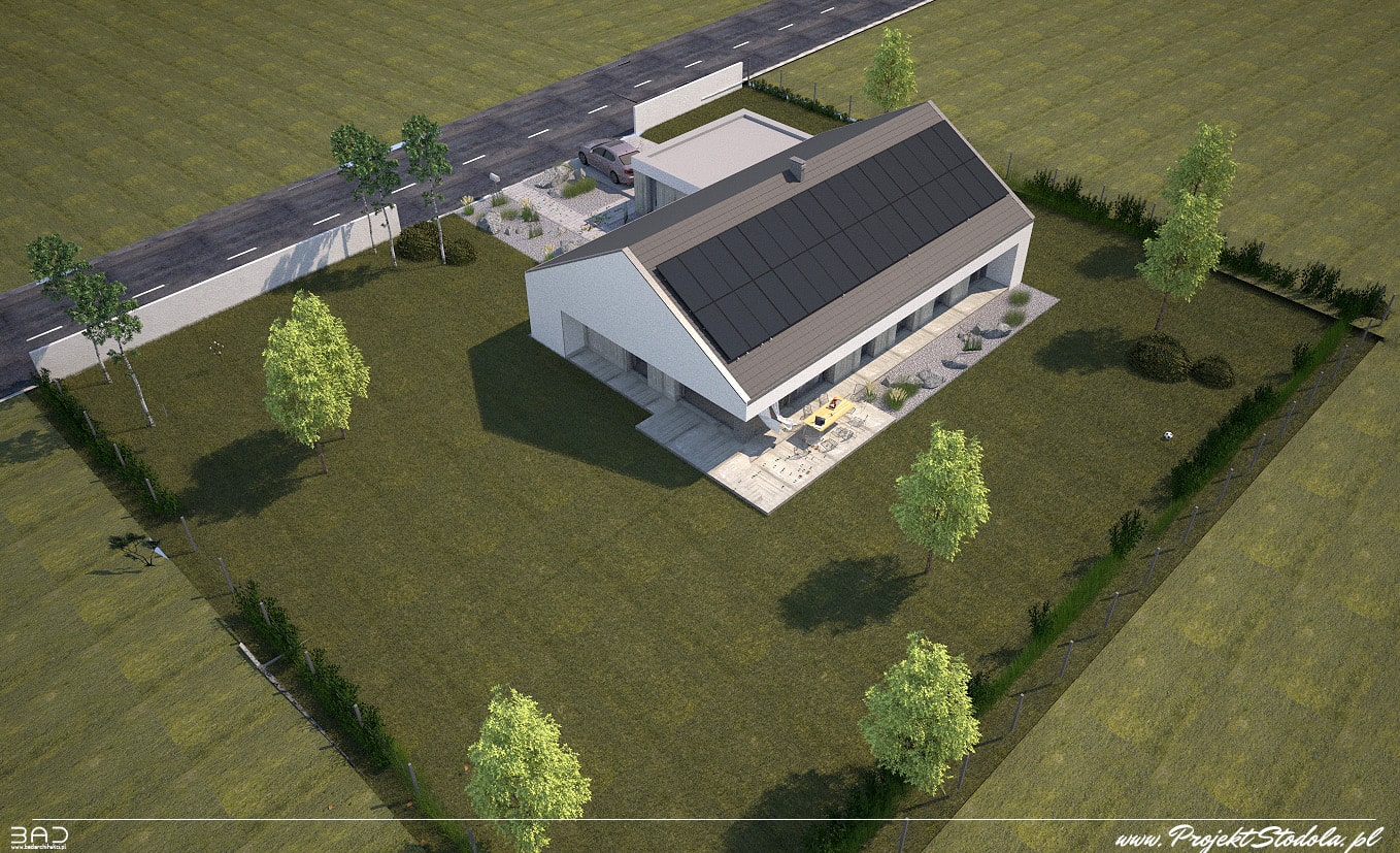 Additionally, the simple gable roof allows for the installation of a photovoltaic system with up to 51 panels, generating a power of approximately 15 kW. The visualizations present 34 panels generating around 10 kW of power.