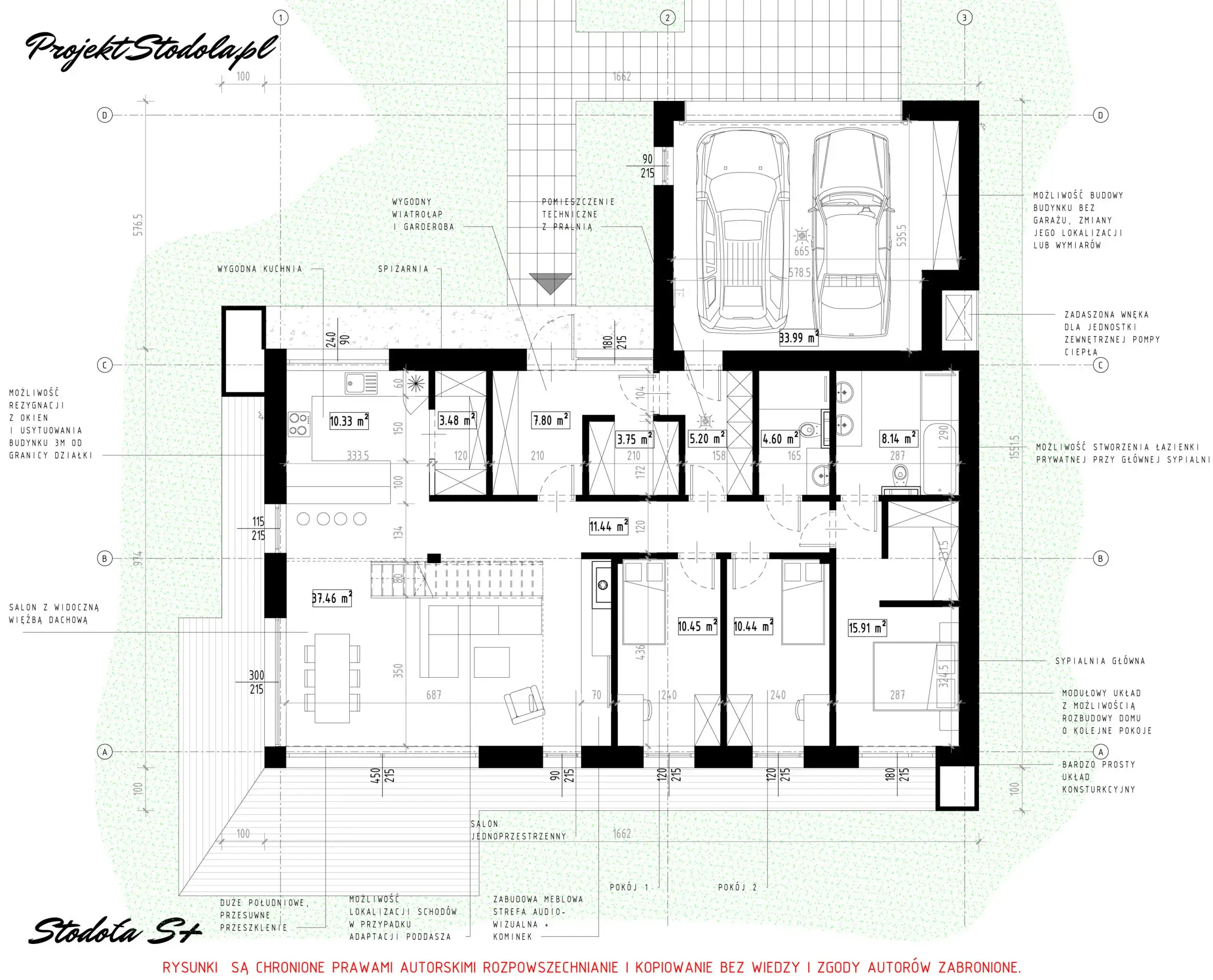 Have you already seen our Barn House S? If you liked its straightforward layout but are preparing for a slightly more ambitious construction, S+ is the project for you. Barn S+ is a simple single-story house (with the possibility of adapting the attic), with a straightforward rectangular floor plan. Even on the ground floor, it accommodates up to 3 bedrooms, and with the potential for attic conversion, it provides an excellent home for a larger family. It doesn’t require a very large plot of land, especially since there is the option to forgo the garage, change its dimensions, or relocate it. This project has a simple and clear functional layout – exactly what we love the most! In the entrance zone, there is a convenient vestibule and a cloakroom connected to the garage and utility room. From the vestibule, we enter the living area of the house with a comfortable living room and kitchen, which includes a practical pantry. The main bedroom has its own walk-in closet and bathroom.