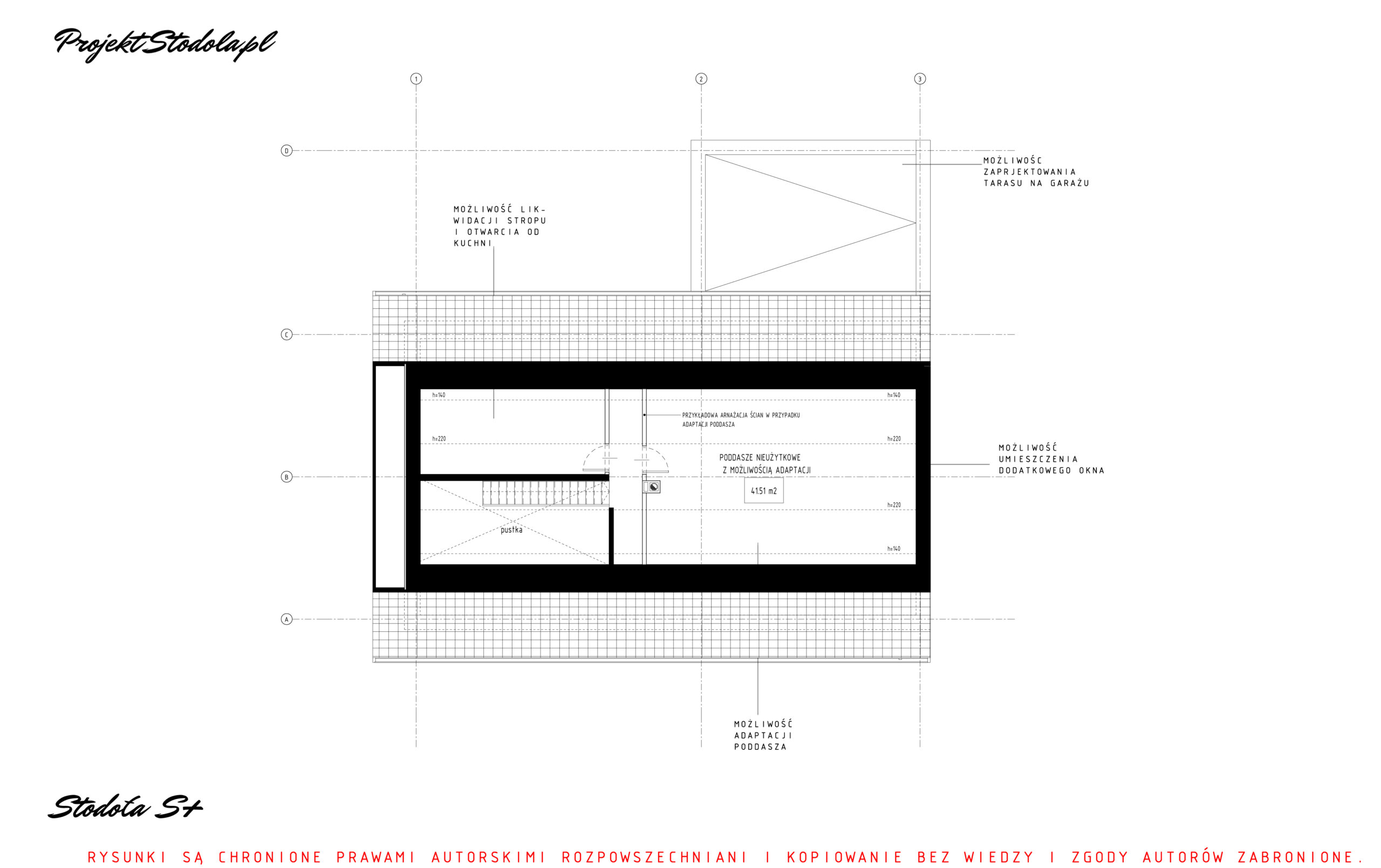 The building has a simple and clear functional layout. In the entrance zone, there is a convenient vestibule and a cloakroom connected to the garage and utility room. From the vestibule, we enter the living area of the house with a comfortable living room and kitchen. There is a pantry located near the kitchen. In the second part of the house, there are two rooms and the main bedroom with a walk-in closet and a bathroom. The house has two bathrooms, one of which is a private bathroom dedicated to the main bedroom, but it can be converted into a shared bathroom. The utility room is designed to accommodate all necessary appliances, as well as a washing machine and dryer. The living room and all the rooms have access to the terrace and garden. The living room is also open to the full height, up to the roof structure. In the living room, there is a possibility to install representative stairs in case of adapting the attic.