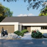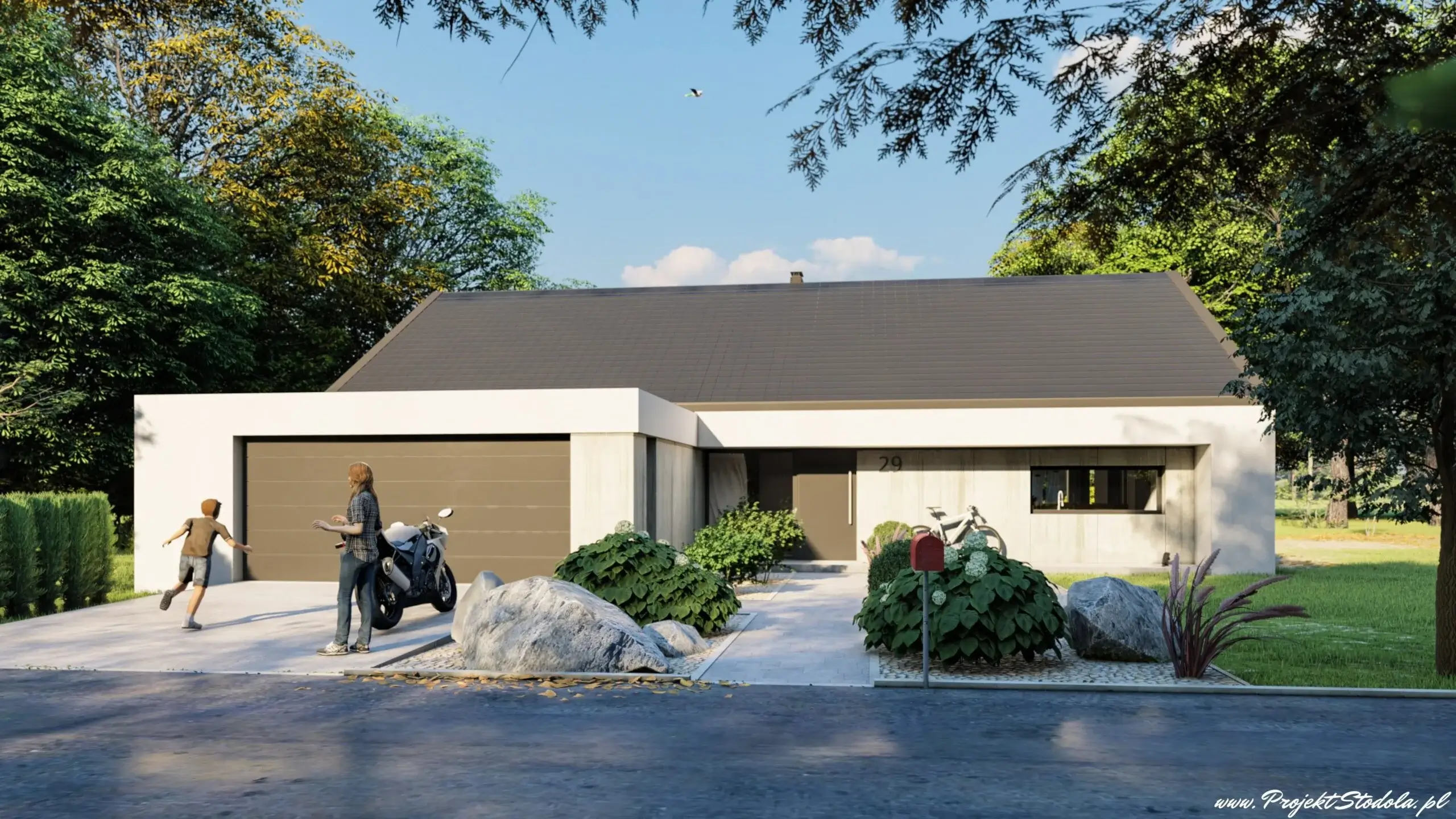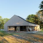 A simple single-story house (with the possibility of adapting the attic), in a rectangular plan, covered with a symmetrical gable roof with a slope angle of 30° (ridge parallel to the access road). A garage volume is added to the building from the entrance side (the volume is independent, and the building can exist without the garage). The very simple structural layout, based on three axes, a straightforward gable roof, and a wooden ceiling, makes the house easy and cost-effective to build. The building’s façade is modern and minimalist, with a natural tone – white combined with architectural concrete. There is the possibility of adjusting the materials to reference the local context or the investor’s individual preferences. Urbanistically, the building fits well on a plot with access from the north. There is the option to change the garage’s location to suit narrow plots with access from the east or west, depending on the version.