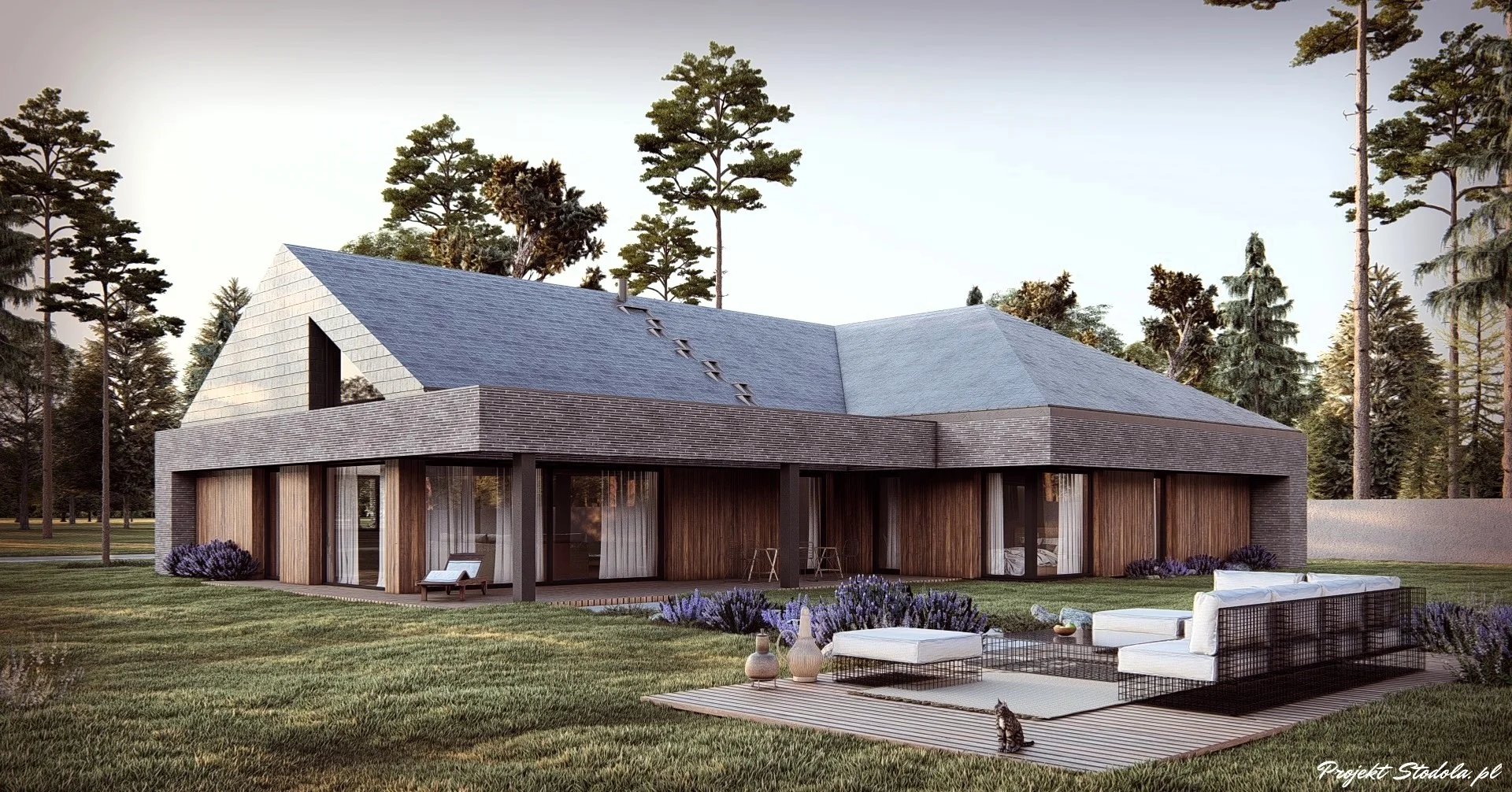 A modern and minimalist single-story house designed in the shape of a T, topped with a multi-pitched, symmetrical roof with a slope of 30° (the main ridge is parallel to the access road). The front side of the building features a vestibule, a wardrobe, and a garage with access to a technical room. The main circulation corridor is in the shape of an L, running along the entire building and connecting various functions. Directly adjacent to the garden area is the living room with a dining area and kitchen, open to the relaxation part of the plot. From this space, there is also access to a comfortable covered terrace.
