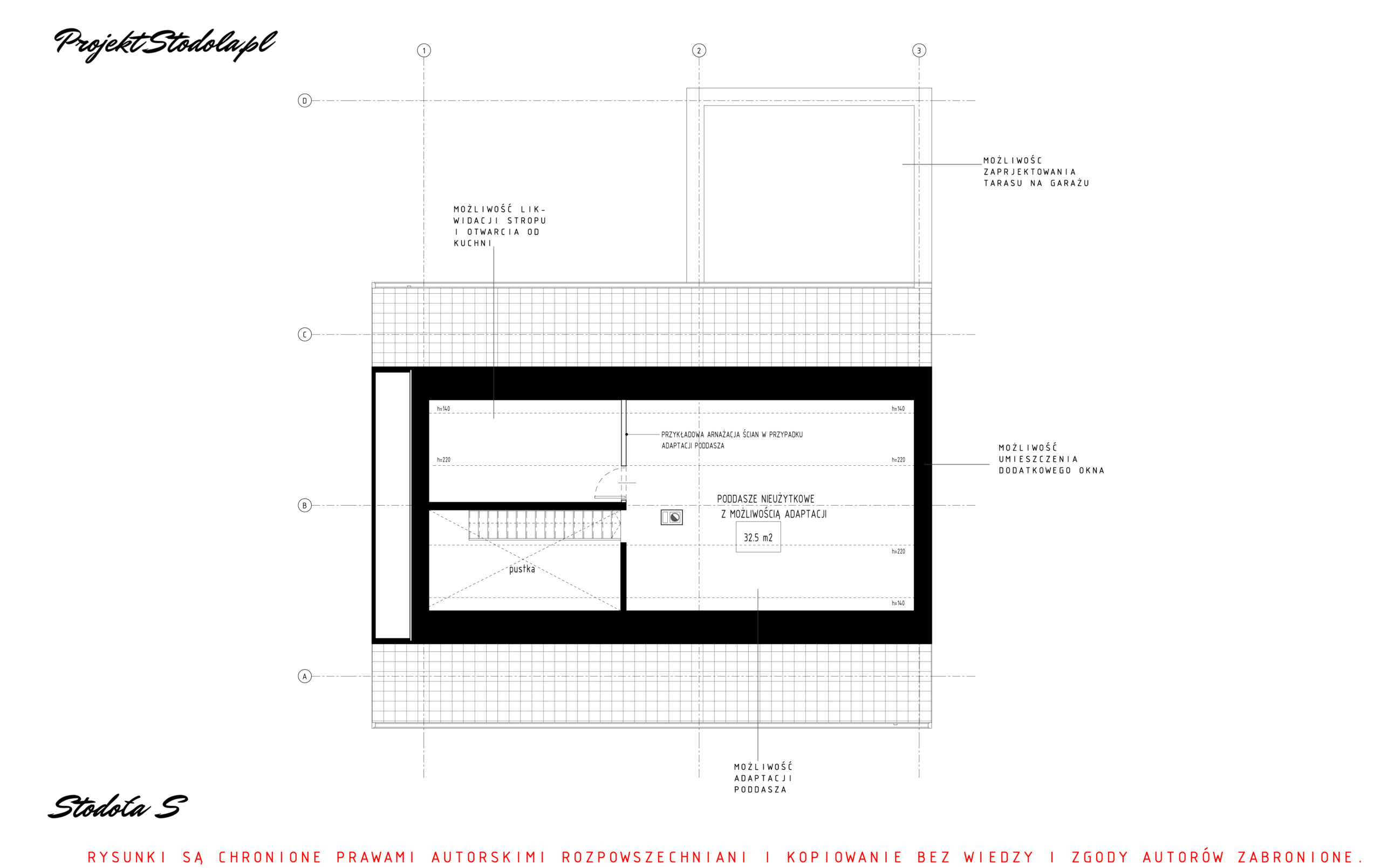 The building has a simple and clear functional layout. In the entrance area, there is a comfortable vestibule and a wardrobe connected to the garage and technical room. From the vestibule, we enter the living area of the house with a comfortable living room and kitchen. There is a pantry next to the kitchen. In the second part of the house, there is one room and the main bedroom with a wardrobe. The house has one shared bathroom, and if needed, an additional toilet can be created by separating it at the entrance in the wardrobe area. The technical room has space for all necessary equipment, as well as a washing machine and dryer. The living room and all the rooms have access to the terrace and garden. The living room is additionally open up to the full height, extending to the roof structure. In the living room, there is the possibility to install representative stairs in case of attic adaptation.