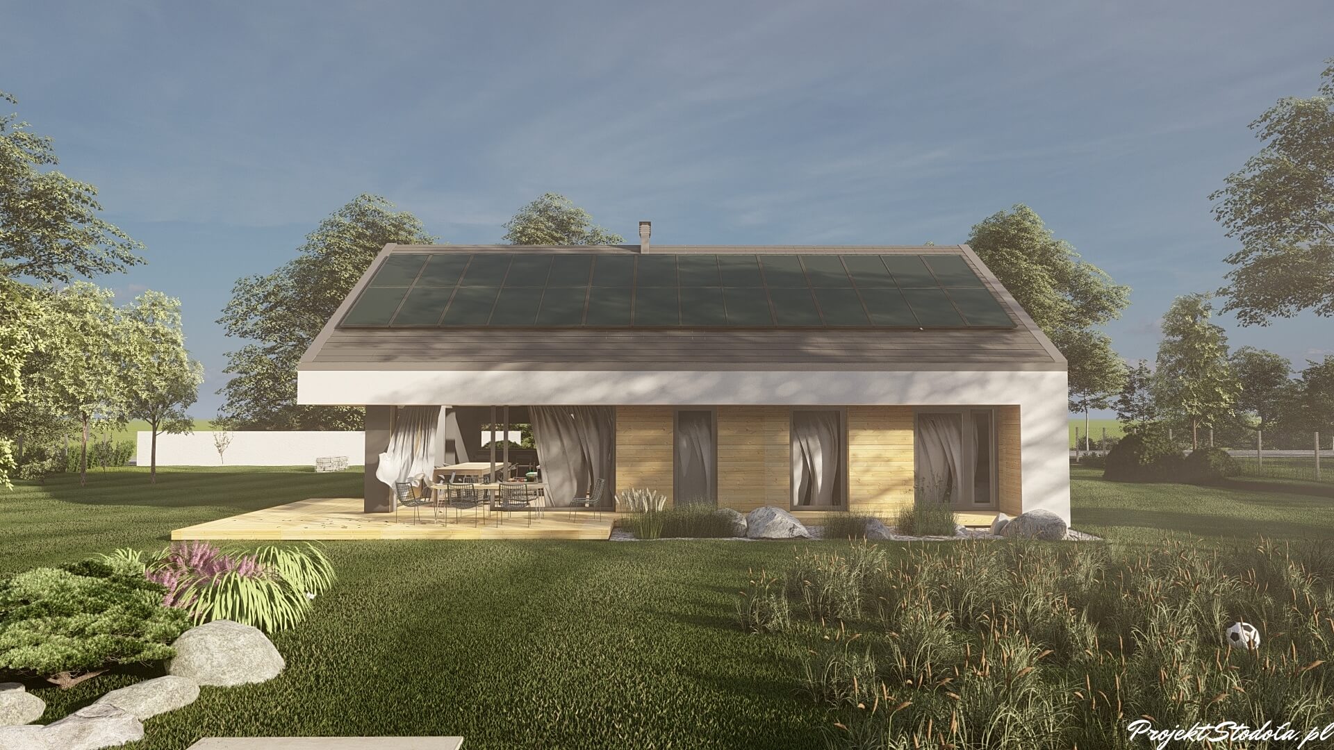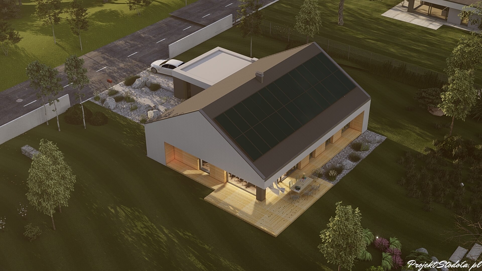 Additionally, the simple gable roof allows for the installation of a photovoltaic system with up to 42 panels, generating a power of approximately 12.5 kW. The visualizations show 28 panels generating around 8.5 kW of power.