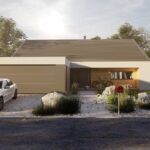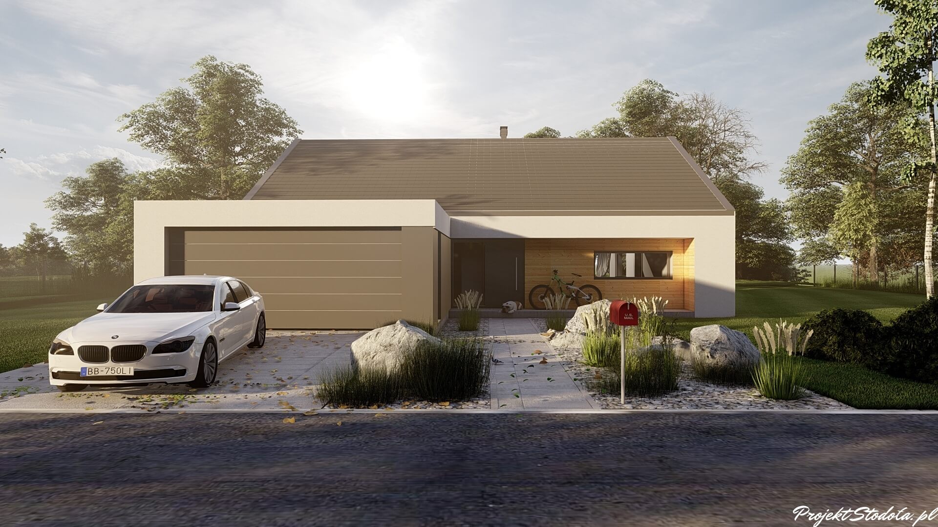 A simple single-story house (with the possibility of attic adaptation) in a rectangular shape, covered with a symmetrical gable roof with a slope angle of 30° (ridge parallel to the access road). A garage volume is attached to the building from the entrance side (the volume is independent, and the building can exist without a garage). The design features a very simple structural layout based on three axes, a simple gable roof, and a wooden ceiling, making the house easy and cost-effective to build. The building facade is modern and minimalist, in natural tones – white combined with wooden planks. There is an option to customize the materials to match the local context or the investor’s individual preferences. Urbanistically, the building suits a plot with a north-facing entrance. There is also the possibility to change the garage’s location to fit narrow plots with entrances from the east and west, depending on the version.